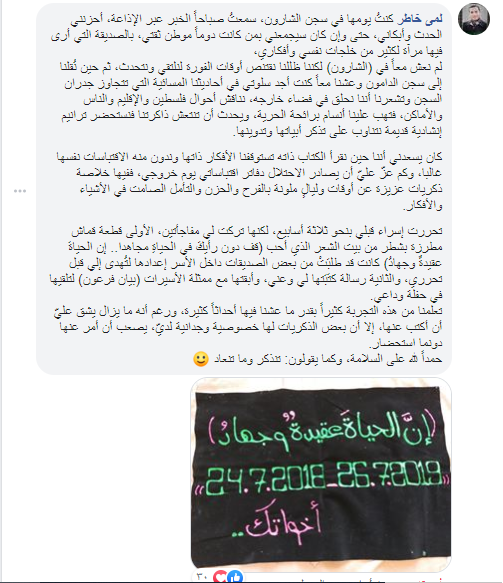ثم نستقبل ما بقي لنا من حياتنا وأحبابنا، وكأن حواسنا تعطلت مع الاعتقال والآن تبدأ رحلة تكيف جديدة، فالعين تبدأ تتكيف مع المحيط الجديد، حتى المساحات في البيت، تحتاج وقتًا حتى تنسجم معها، وكذا مع كل حاسة أخرى.